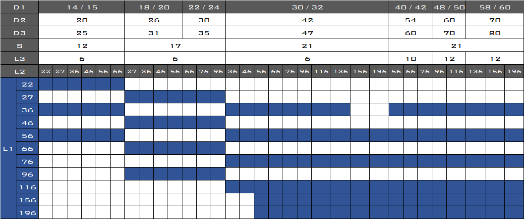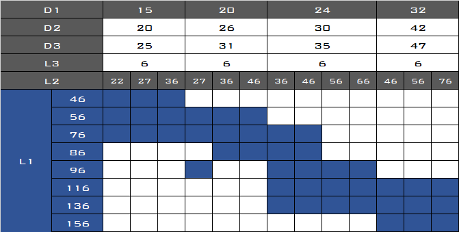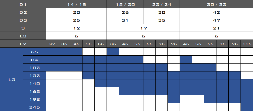 Legenda: D1= Diâmetro Principal de Encaixe D2= Diâmetro do Corpo D3= Diâmetro da Cabeça L1= Comprimento da Ponta L2= Comprimento do Corpo L3= Altura da Cabeça S= Comprimento de Guia Material SAE 8620 Dureza= 58-64 HRC | |